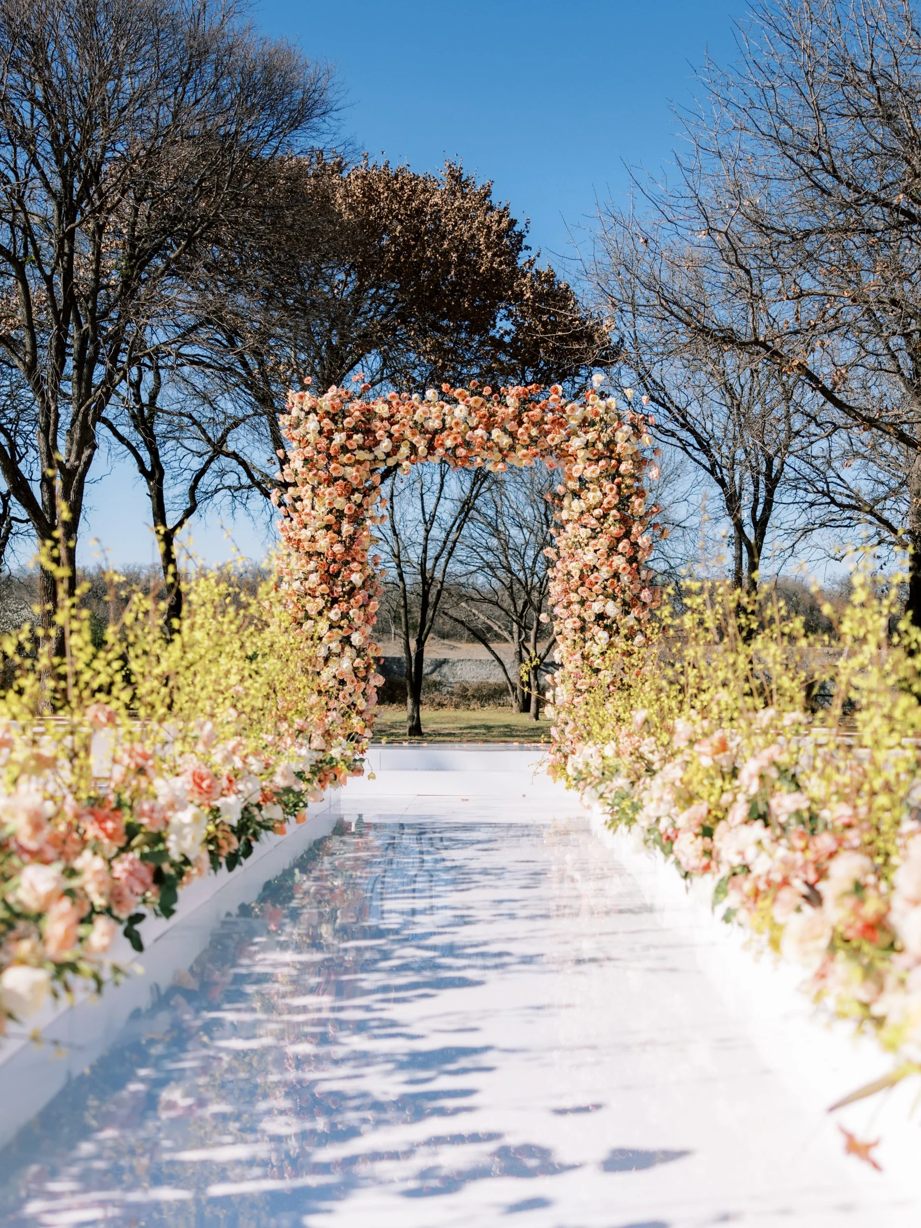 We partnered with luxury Dallas wedding planner, Alexa Kay Events, to create a jaw-dropping floral display that would include premium blooms from all over the world for our couple. We wanted the floral arch to be the hero design of the day. Tall, forsythia branches lined the aisle, with butterflies and bees weaving quietly through the petals.